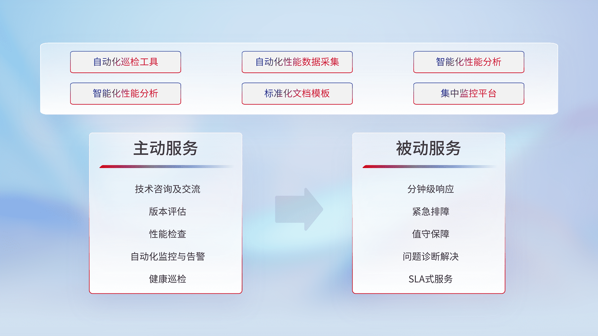 智能化工具和标准化文档,,保障服务质量,,,,提供主动服务(包含技术咨询、、、、版本评估、、、性能检查、、自动化监控与告警、、健康巡检)和被动服务包含(分钟级响应、、、、紧急排障、、、、值守保障、、、问题诊断解决、、、SLA服务)。。。